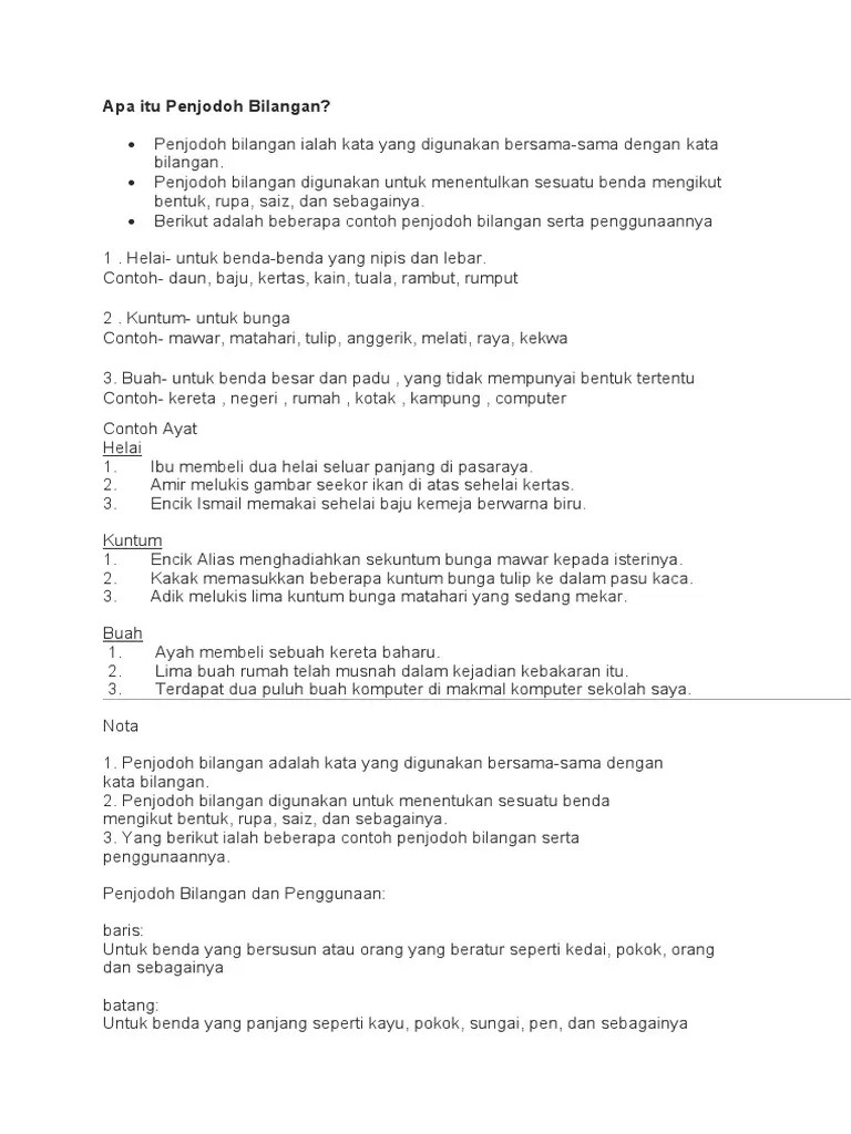 Rohaini bt mat zin di 8:15 pg. Seangkatan pegawai polis bergegas ke tempat kemalangan itu. Harun menabur segenggam beras kepada anak ayamnya. Yang berikut ialah beberapa contoh penjodoh bilangan serta penggunaannya. Rusmiha memasukkan dua kuntum bunga cengkih semasa memasak air gula. 1) batang 2) biji 3) bilah 4) buah 5) helai 6) naskhah 7) pasang 8) ulas disclaimer: